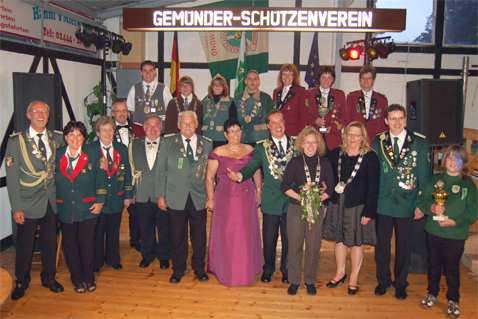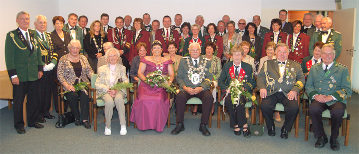 Schülerprinzessin Annika Wiedemeyer (hi.,3.v.li.) und Bürgerkönigin Sylvia Mauel mit Ehemann (vo. 3.v. re.). Das scheidende Königspaar Dieter Feyerabend mit Anita Schmitz (vo.,7.v.re.) das neue Königspaar Wido Schmidt mit Königin Nicole Aengenheister (vo.,5.v.re.) , Laserschützen-Pokalgewinnerin Lisa Schmitz (vo.,1.v.re.), ehemaliger Kaiser Horst Rupp mit Gattin Ulrike (vo.,5.v.li) und Kaiser Rainer Schmitz mit Ehefrau Ute (vo.,1.v.li) . |