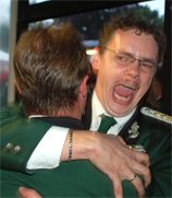 Riesenfreude bei der Kompanie und den Schützenbrüdern über den erfolgreichen Schuss und den neuen Schützenkönig.