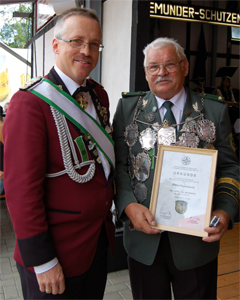 So erhielten König Dieter Feyerabend (St. Peter-Kompanie) und Karl-Peter Wergen (Hubertus-Kompanie) Orden für ihre 25-jährige Vereinszugehörigkeit.