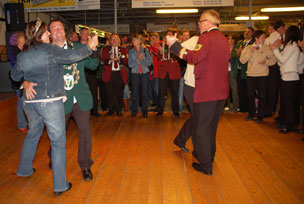 Begleitet mit dem Präsentiermarsch von der Band " de Schlingele " wurde der neue Schützenkönig 2010, Heinz Willi Fedder von seiner Kompanie in die Halle getragen.