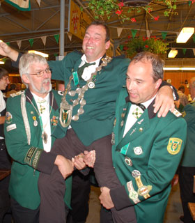 Zu guter Letzt war es aber ein ganz anderer aus der gleichen Kompanie wie Silvio und Werner der dem Vogel den Gar aus machte. Mit dem 47. Schuss und nach gut 2 Stunden, schmetterte Heinz Willi Fedder den Vogel von der Stange und wurde somit der 70. Schützenkönig unseres Regimentes. |