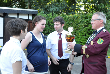 Nachdem der Jungschützenprinz und die Sieger des Damenpokals ermittelt waren wurde, bevor es zum Königsvogelschiessen ging der Regimentspokal ausgeschossen. Hier ging es nach dem KO System. Jede Kompanie stellte 3 Schützen, die jeweils einen Schuss auf eine Distanz von 10 Meter mit dem Luftgewehr abfeuern durften. Die Gruppe die in der Runde mehr Ringe als der direkte "Gegner" hatte war weiter. Im Finale schossen sozusagen Eltern gegen ihre Kinder. Die St. Michael-Kompanie stand gegen die St. Nikolaus-Kompanie im Finale. Umso größer war die Freude als bekannt wurde, dass die Kinder die Eltern geschlagen hatten. Das Team der St. Nikolaus-Kompanie ( Carolin und Andreas Mertens mit Sabrina Schäfer ) siegten mit 2 Ringen Vorsprung und gewann damit den Regimentspokal.
