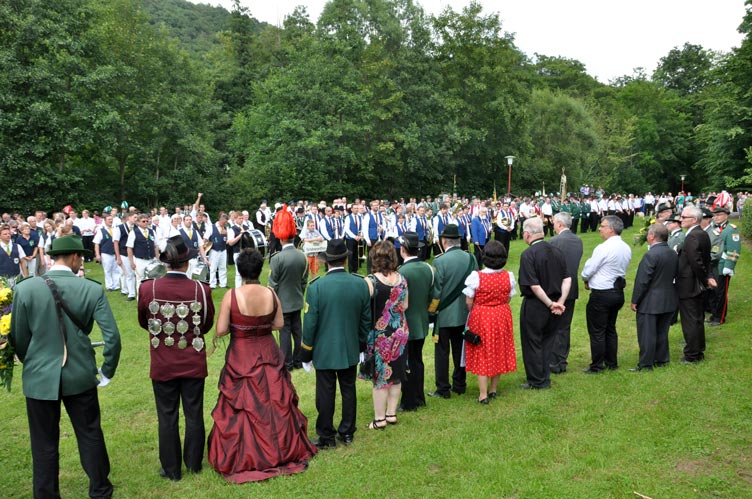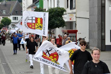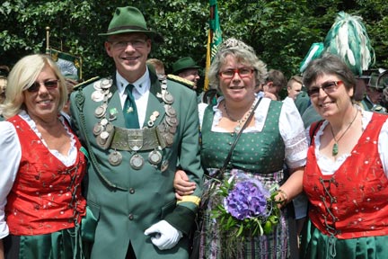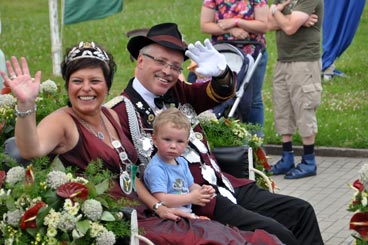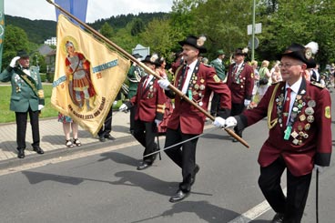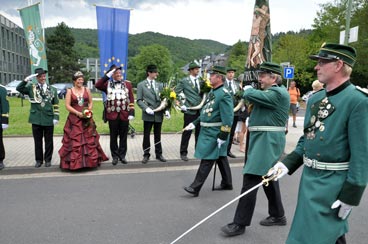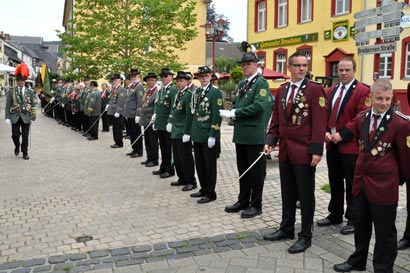 | Um 13 Uhr trafen die ersten eingeladenen Gastvereine und Musikvereine sowie Tamborkorps auf dem Schützenplatz ein, um beim Publikum beliebten Festzug durch die Gemünder Innenstadt teilzunehmen. Aufstelllung war bereits um 13.30 Uhr am St. Sebastianusweg wo auch der Vorbeimarsch der Majestäten zu sehen war. |