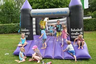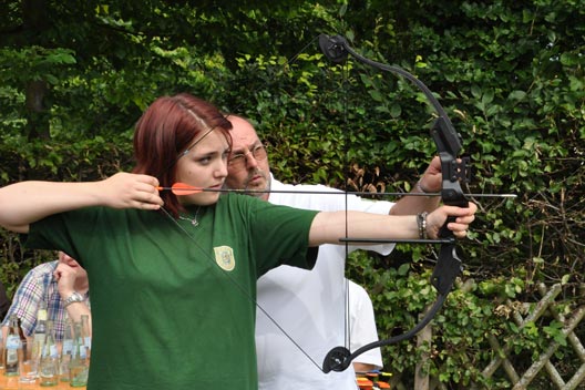 Die Kuchentheke, in diesem Jahr mit bekannten Gesichtern und alle in Tracht angeführt von Hannah Meyer, stemmte den Andrang der hungrigen Schützen mit ihrem 5-köpfigen Team ohne Probleme. So wie die jungen Frauen, so hatten Markus und Manfred Müller im Schießstand aber auch alles im Griff. Hier durften Kinder und Erwachsene die noch keine Schützen waren, die Sportart testen und sehen ob es eine neue Leidenschaft werden würde. Ebenso konnte man sich unter der Anleitung von Reinhard Maeding beim Bogenschießen erproben, hier musste man allerdings 16 Jahre und älter für sein. Und sollte den Kleinen das Schießen doch noch nicht so zusagen, hatte man draußen zu Belustigung eine Hüpfburg aufgestellt, wo sie ihren Spaß hatten. |