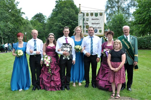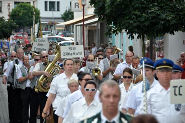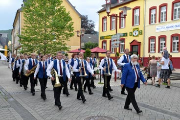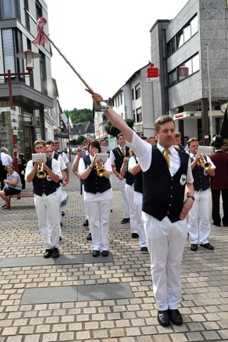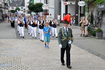 7 Musikkapellen begeisterten die Schützen und die Bevölkerung mit ihrem Können. Die Musikvereine und Tambourcorps (TC „Eifelgold“ Herhahn-Morsbach, MV Schöneseiffen, TC Wahlen, MV Sistig Krekel, Spielmannszug Dreiborn, Blasorchester Marmagen und MV Reifferscheid) boten nicht nur Musikalisches. In Höhe des Finanzamtes wo der Vorbeimarsch an den Gemünder Majestäten stattfand, zeigte so mancher Hauptmann, dass man im Stechschritt marschieren kann. Zahlreiche Ehrengäste aus Wirtschaft, Kirche und Politik sowie das Gemünder Königspaar Chrsitoph und Heike Kammers, die Bürgerkönigin Hannelore Fedder mit Gatten Heinz-Willi und Kaiser Wido Schmidt nahmen an dem Festzug durch die Innenstadt teil. Die Zugteilnehmer wurde dort durch eine großzügige Getränke-Spende von Familie Geuenich, den Wirten vom "Brauhaus Gemünd" in der City mit Wasser versorgt.