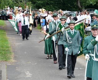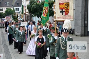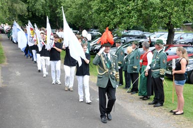 Die Gastvereine aus dem Bezirksverband Schleiden und aus den befreundeten Bruderschaften aus Lechenich, Lammersdorf, Rötgen, Rurberg, Jünkerath formierten sich pünktlich um 14 Uhr zu einem prunkvollem Festzug.