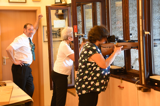 Am Schützenplatz angekommen wurde es direkt ernst am Schießhochstand und im Schützenhaus auf der Laser und Luftgewehrbahn. Die Wettkämpfe um die Prinzenwürden standen an, ebenfalls wollten die Regiments- und Damenpokale ausgeschossen werden.